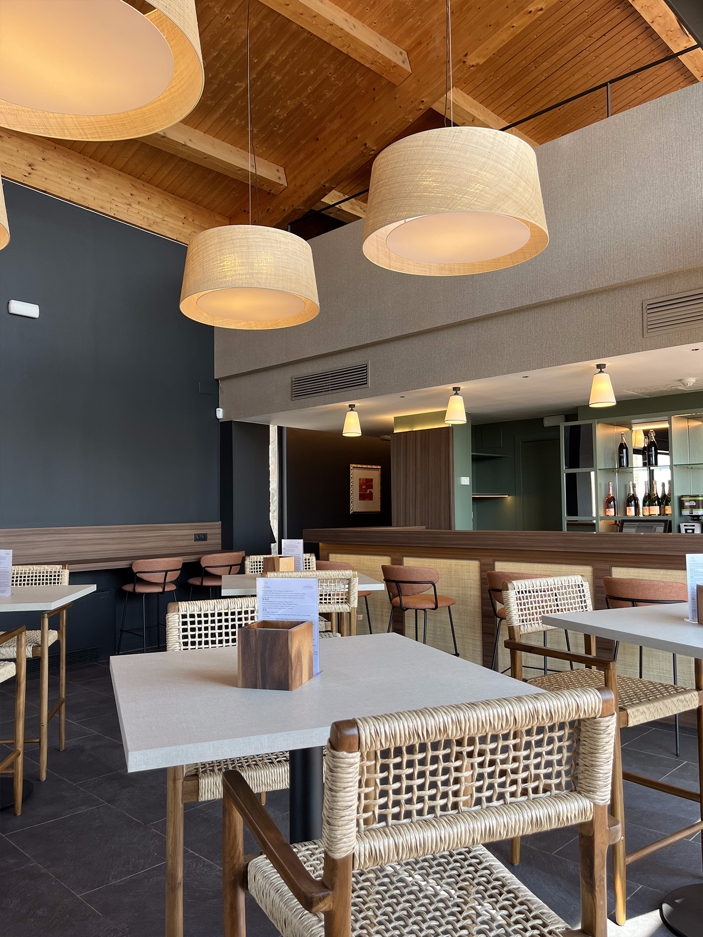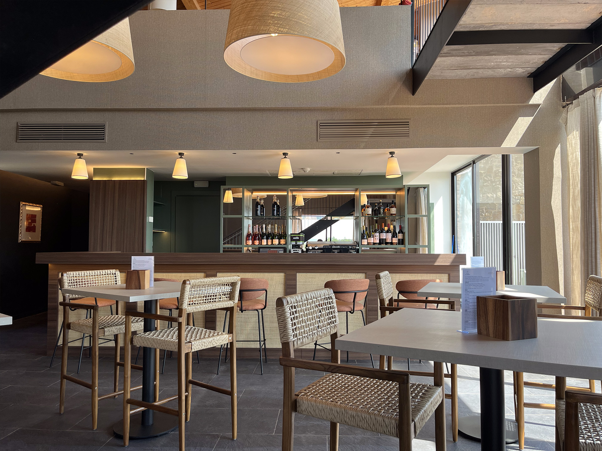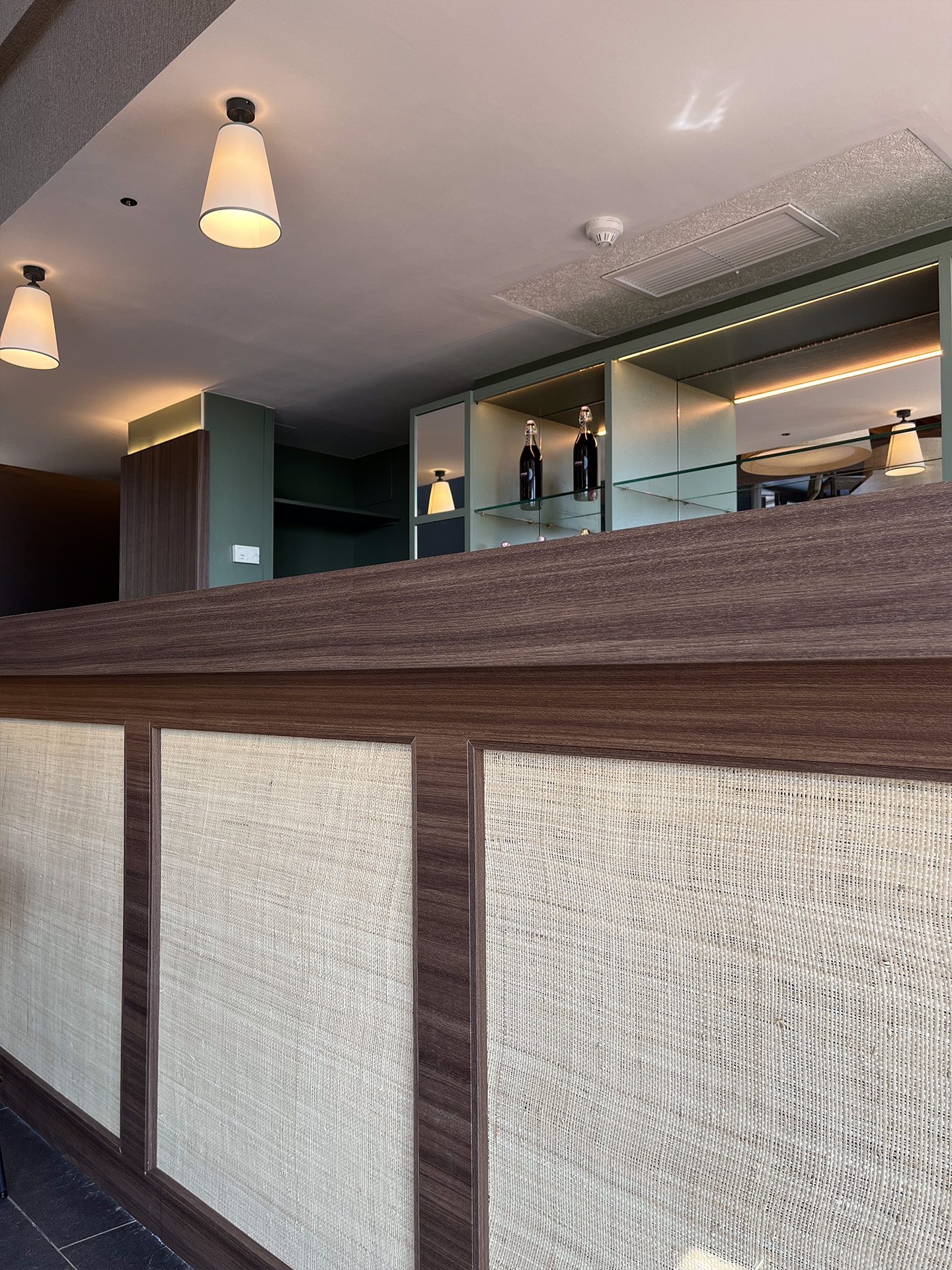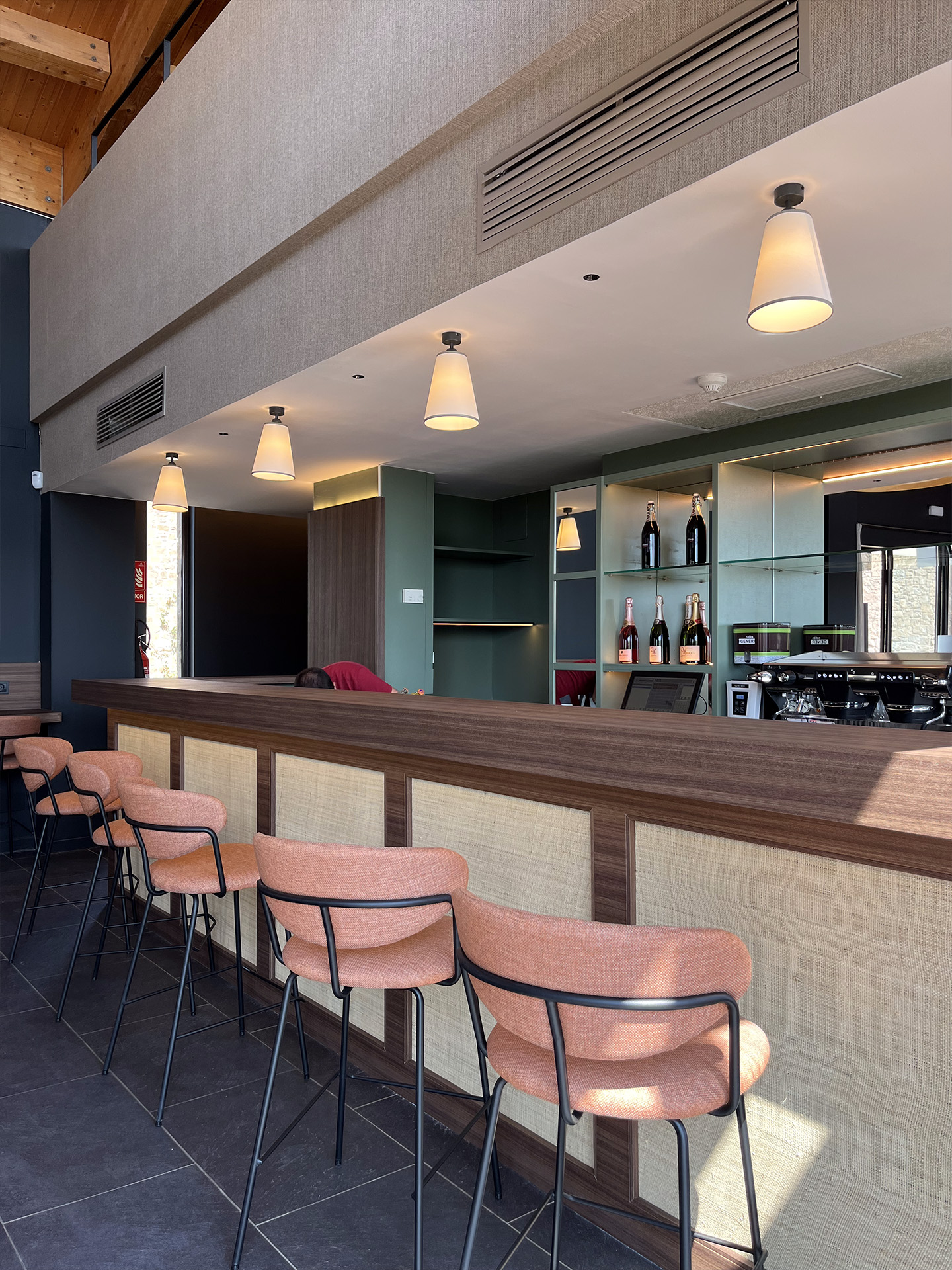La zona del bar se renovó por completo, adaptando la barra existente para crear una estética completamente nueva, elegimos el mobiliario y diseñamos los sofás y el banco. Además, mejoramos la iluminación general, sustituyendo las grandes pantallas de las lámparas existentes por lámparas y apliques que realzaron la atmósfera del espacio. Tambien jugamos con la iluminación indirecta para crear ambientes de paso acogedores. En las habitaciones, se renovó la imagen mediante pintura combinando tonos verdes con un papel pintado, uso de nuevas cortinas dobles para el paso de luz y la privacidad y mesitas de noche en nogal.