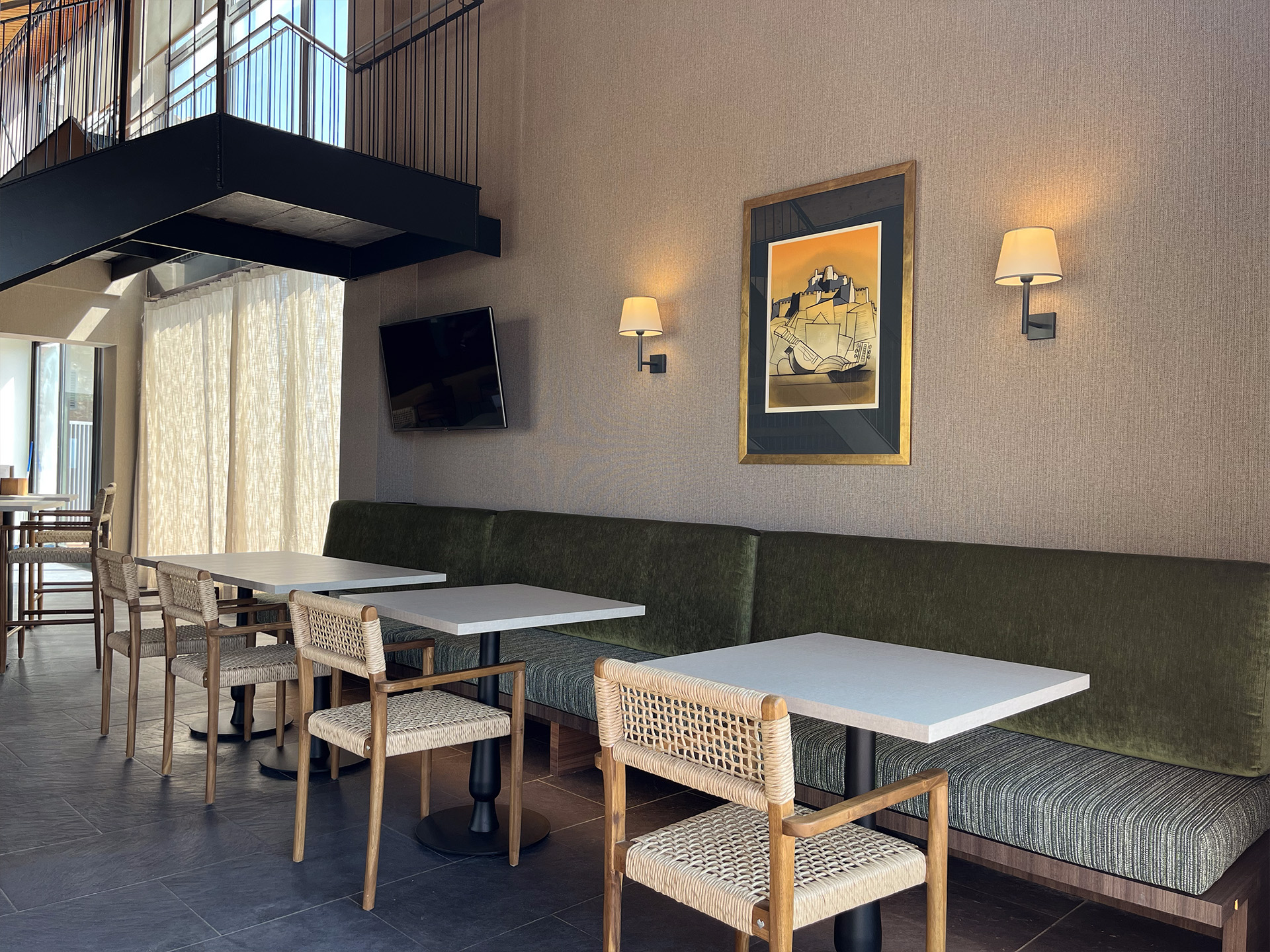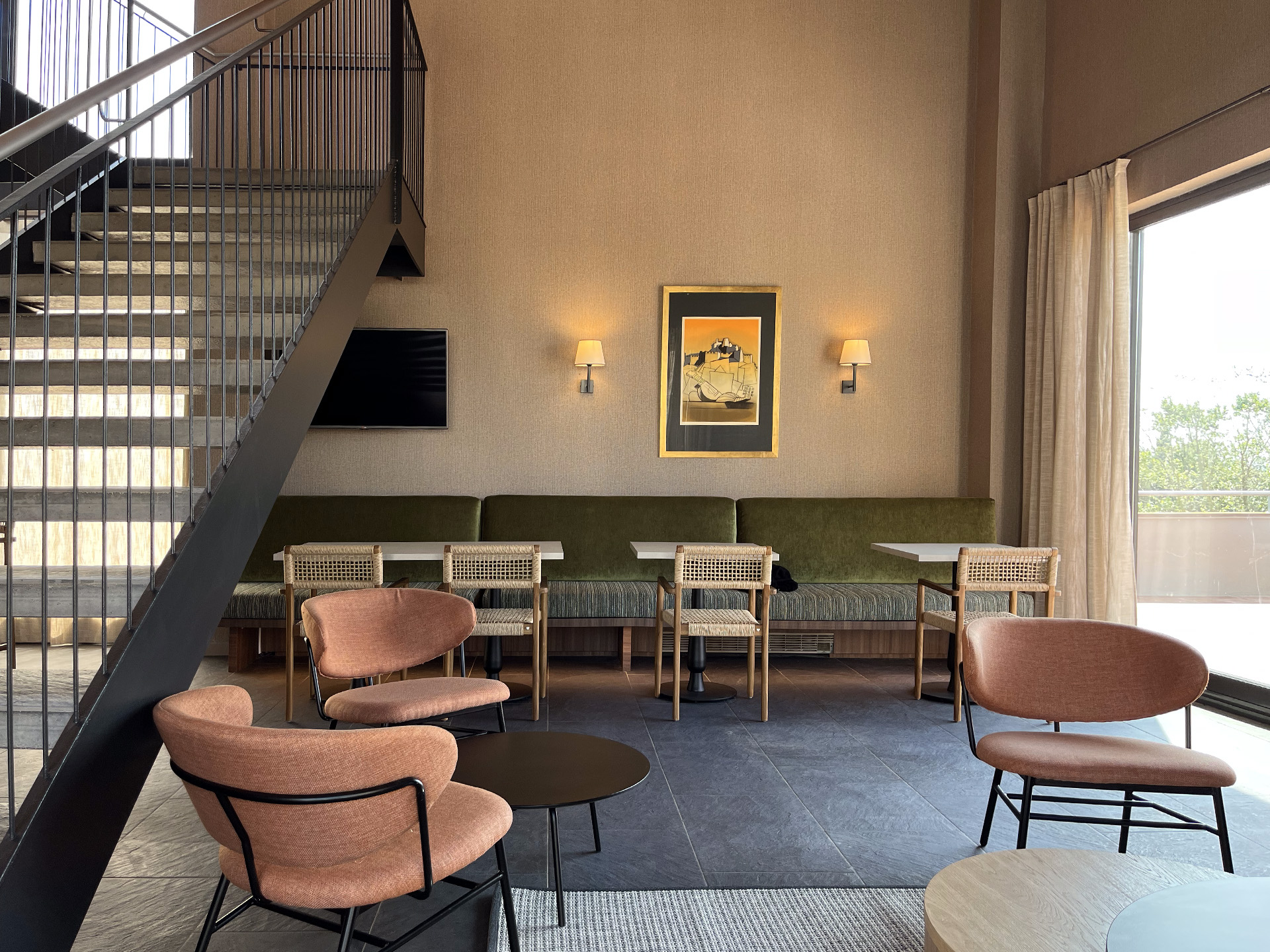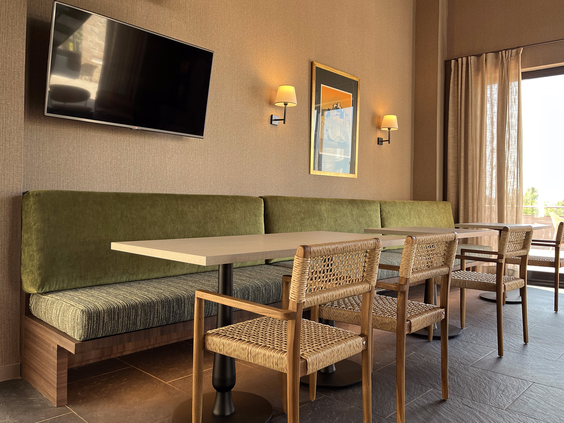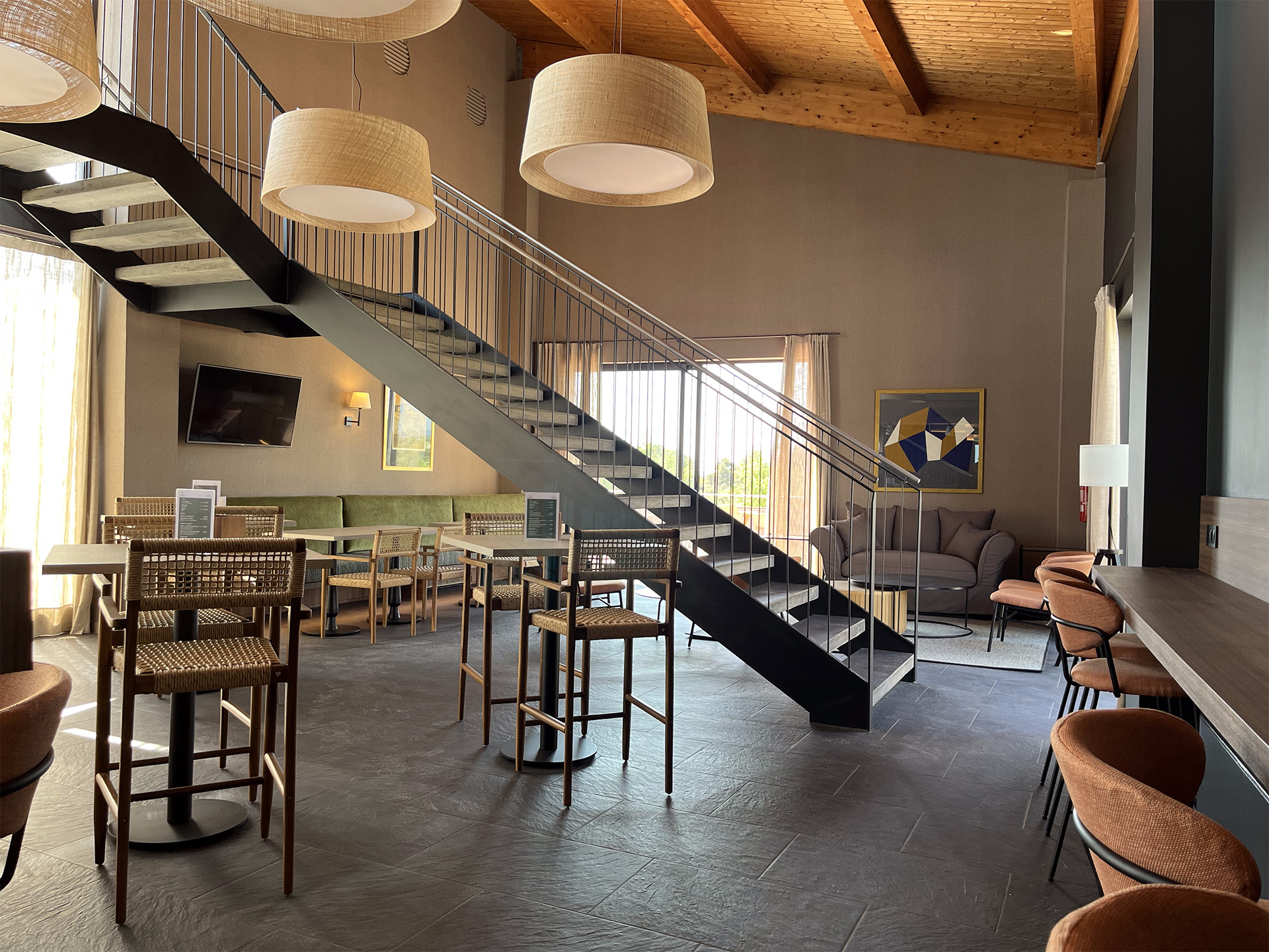 La zona del bar se renovó por completo, adaptando la barra existente para crear una estética completamente nueva, elegimos el mobiliario y diseñamos los sofás y el banco. Además, mejoramos la iluminación general, sustituyendo las grandes pantallas de las lámparas existentes por lámparas y apliques que realzaron la atmósfera del espacio. Tambien jugamos con la iluminación indirecta para crear ambientes de paso acogedores. En las habitaciones, se renovó la imagen mediante pintura combinando tonos verdes con un papel pintado, uso de nuevas cortinas dobles para el paso de luz y la privacidad y mesitas de noche en nogal.
